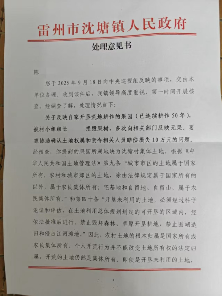 澎湃新闻注意到,此前,雷州市沈塘镇政府作出的《处理意见书》显示,在清理果树前,沈塘村干部已提前与陈女士的父亲沟通过,表示可以协调沈塘村民小组补偿果树损失,但该地块使用权要归还村集体。